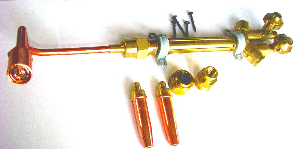 We've redesigned a Victor Style welding torch to create a super desktop or handheld Boro torch. The Victor Style torch is well-known for being a great torch, probably the best in the world. So it made sense to use that design as a base. And what a great boro torch this has become. First, this torch has in the handle two flashback arrestors to prevent dangerous flashback. And then, the Rosebud type tip has been redesigned to accommodate several different tips to allow for a variety of flame intensities and widths. This torch comes with three tips, but others are available. The rosebud type tip shown attached in the picture below has 12 jet ports for a large, smooth flame with great intensity for large projects. The other propane/oxygen tips below are sizes #0 & #1. The center port of these two tips, normally used as a forced oxygen port during metal cutting, has been converted to a propane/oxygen center jet, which is surrounded by a circular wall of flame. This makes for a very hot, fast melting pencil tip shaped flame for wildly effective boro work. Watch the video to see just how fast and effective this torch works. Redesigning an already existing torch also keeps the price low. Measures about 14 inches left to right. Comes with all you see in the pictrure below. Can also be removed from the table and used by hand. Accommodates Victor 300 series tips and accessories (not 100 series).