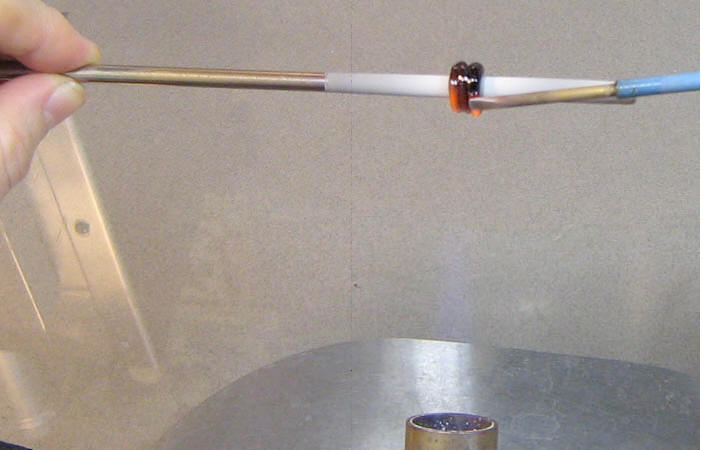 2. Gently heat the tip of your Stringer to a soft glow and set it on the well-heated mandrel.