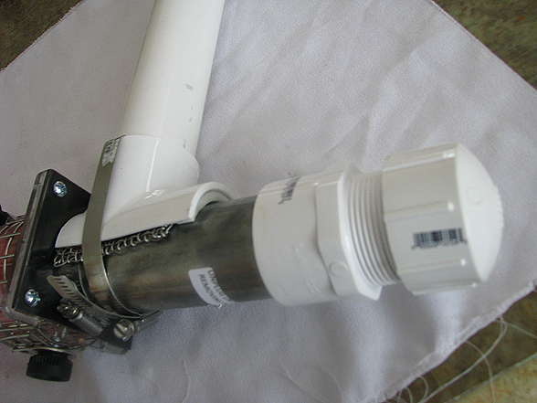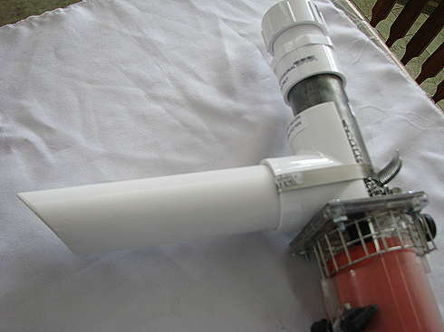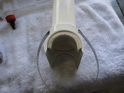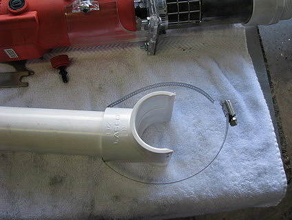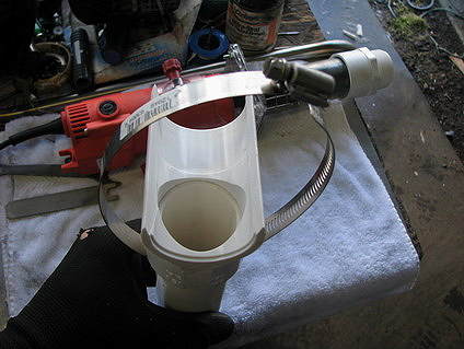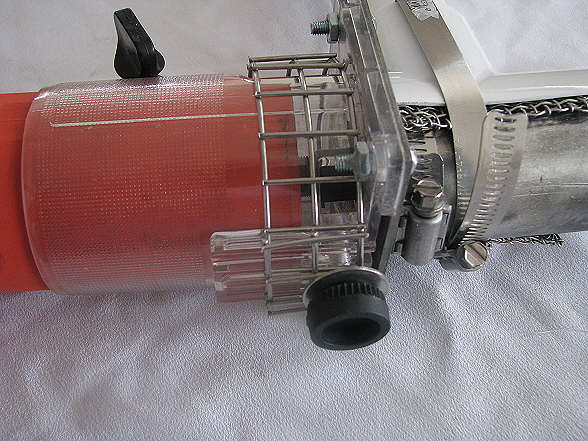 Place the frit screen over the hopper cutout where the finger guard is located and add the PVC shooter. Take a good look at this hose clamp where the tightening screw is. Notice the two staples it is pressed together with. This is the type of hose clamp you need to look for. It is near indestructible.