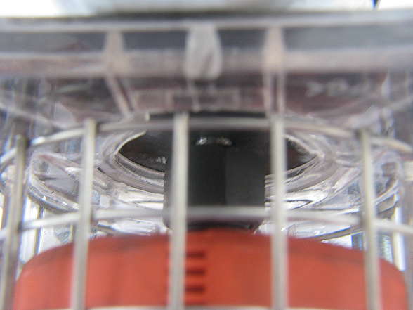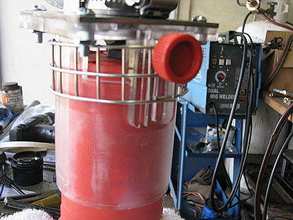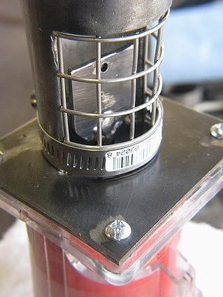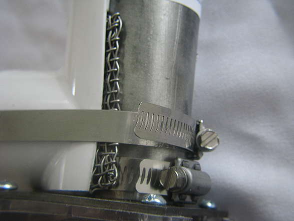 Add the finger guard screen and secure it with a 2 inch hose clamp. Do not operate this machine without this guard in place. Not only does it protect you when cleaning the machine, just in case you do so with the thing plugged in, it also protects the outer screen from damage from large chunks of glass.