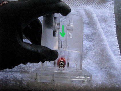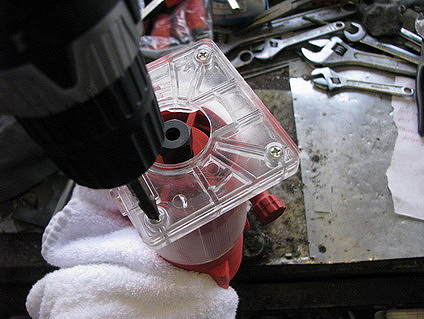 Cut out about an 1/8 inch slice at arrow. This will allow the plastic shroud to tighten down much tighter than normally onto the router motor.