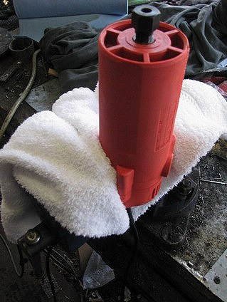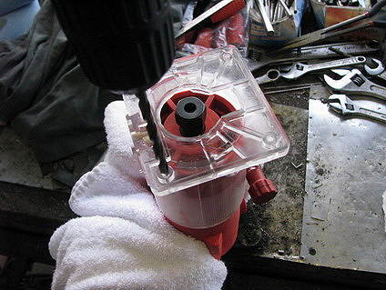 Set the router motor into a bench vice so it can't move as pictured below. Don't over tighten. Use a cloth to protect it.
