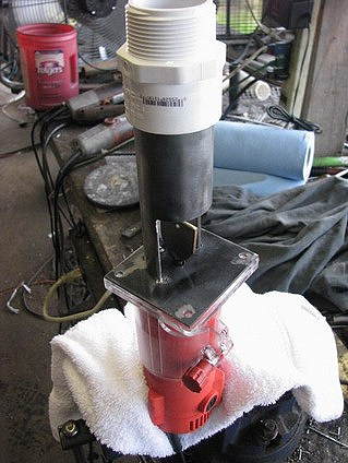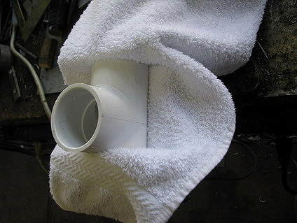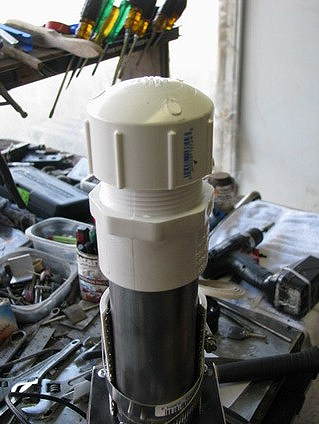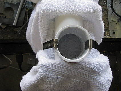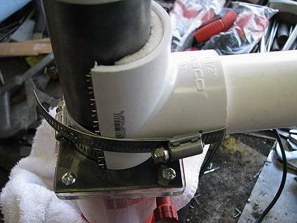 Add the hose clamp halves as below and then drive the 1-1/2 PVC pipe into the Tee, using a rubber mallet. I put a cloth over the end of the pipe also to protect it from damage as I drive it down into the Tee. Because of the hose clamp, the PVC pipe is pretty tight and will need to be driven in place.