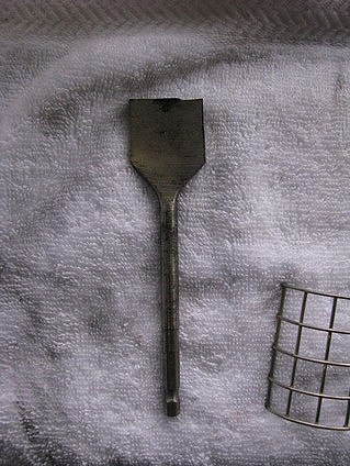 If you are going to make your own bit, here's how. Acquire a 1-1/8 spade bit for this handheld shooter, or an 1-1/4 inch bit for the larger unit. Take off the three points by grinding or cutting. This is high speed steel, very tough stuff.