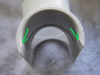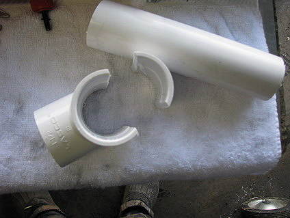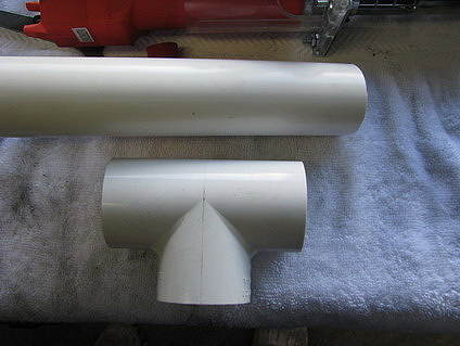 Cut one leg off the Tee. Then, cut about a third off the backside of the Tee. I use a cutoff saw and put a piece of pipe in the Tee to hold it safely in the saw. Also, cut about 8 inches of pipe at a bit of an angle.