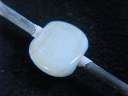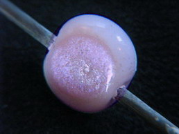 SOP Moonstone White base, Q-colors Iris Amber reduction frit (find here), a strip of dichroic (find here), Golden Copper Sparkle Pixie Dust with a ring of D6 Tr. Rose. Some Metallic Silvery Black dots. |
