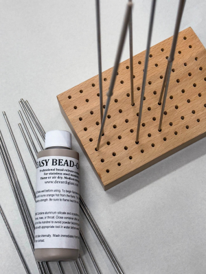 Oak Mandrel Stand - Dip your mandrels in bead release and place them upside down in this handy oak mandrel holder. Can hold 1/8 inch or thinner mandrels. Or drill a few of the holes for larger mandrels. Mandrels in the picture are not included. 5 - 3/4 x 3 - 3/4 inches. Can hold 88 mandrels. $12.95 each. |